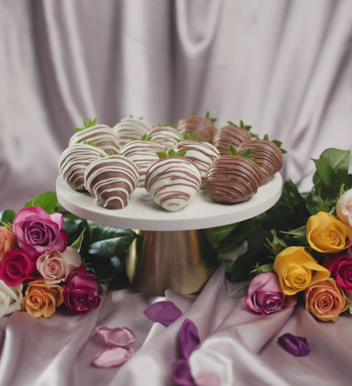 - 6 or 12 strawberries dipped in white chocolaty confection with milk chocolaty drizzle; dipped in milk chocolaty confection with white chocolaty drizzle; dipped in milk chocolaty confection with milk chocolaty drizzle