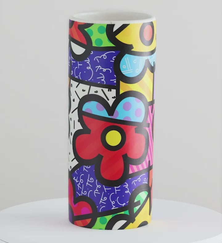 - Keepsake cylindrical dolomite vase decorated with a vibrant motif from artist Romero Britto and featuring the Britto logo on the back; hand-wash only; measures 8”H x 3.5”Dia