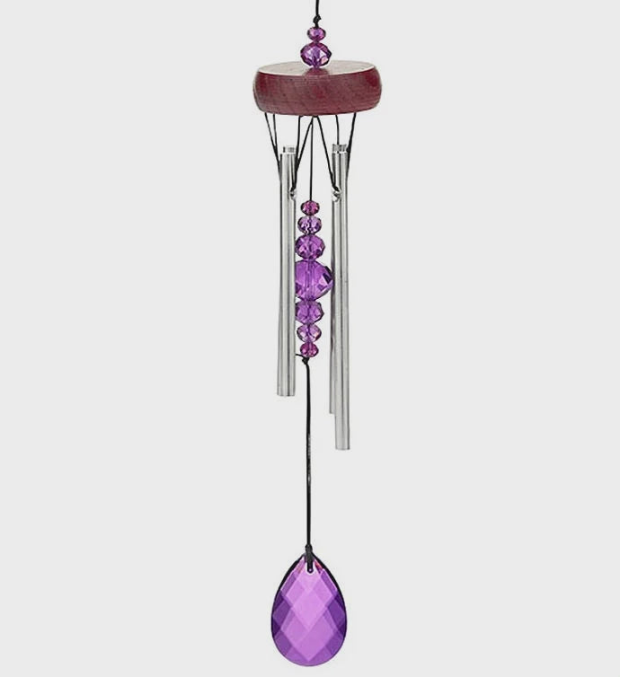 - Mini wind chime by Woodstock Chimes features purple crystal accents on the center anchor; makes a magical sound with minimal air movement; measures 10"L
